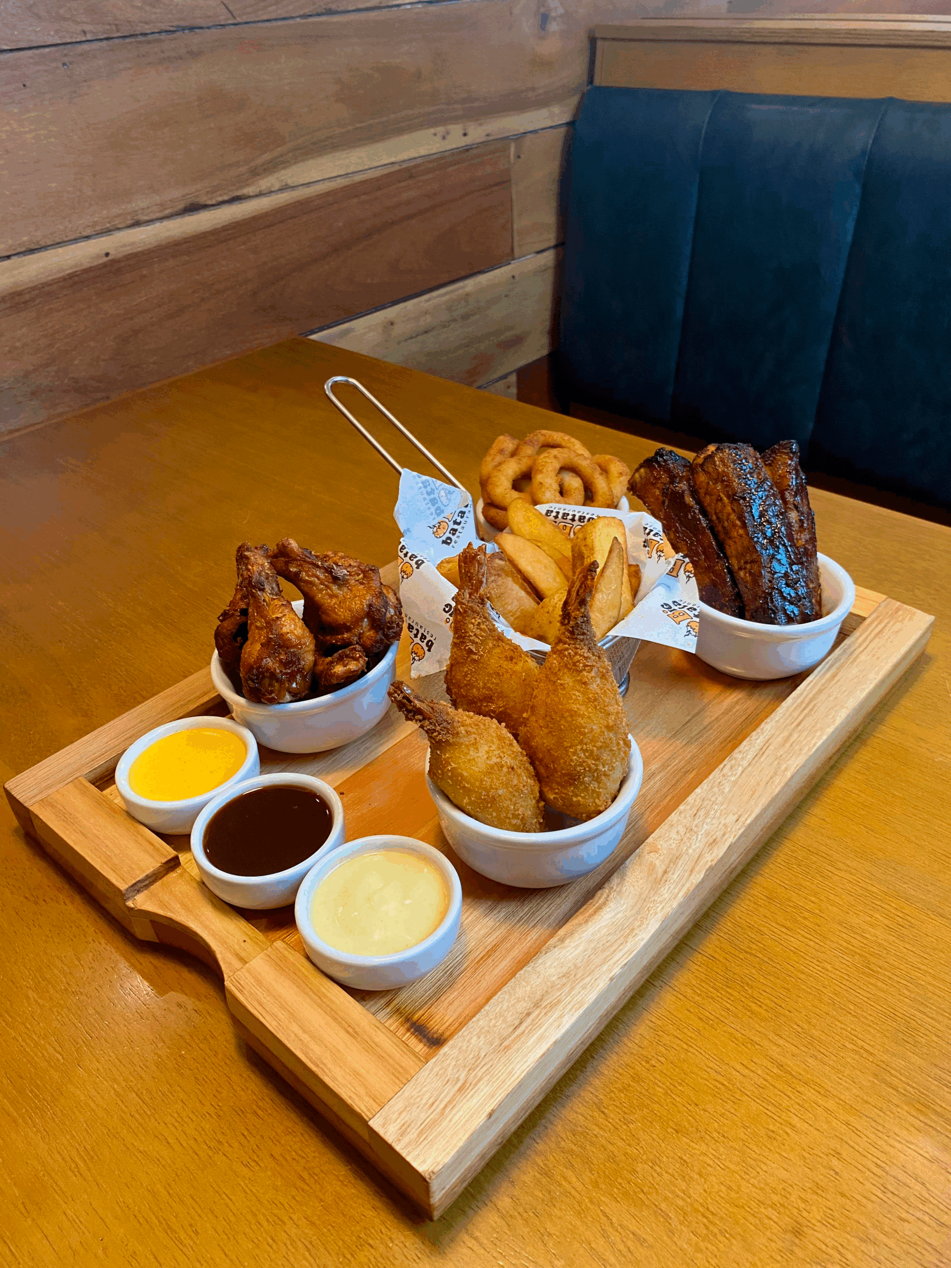batatas rústicas fritas, anéis de cebolas empanadas, acompanhados de 3