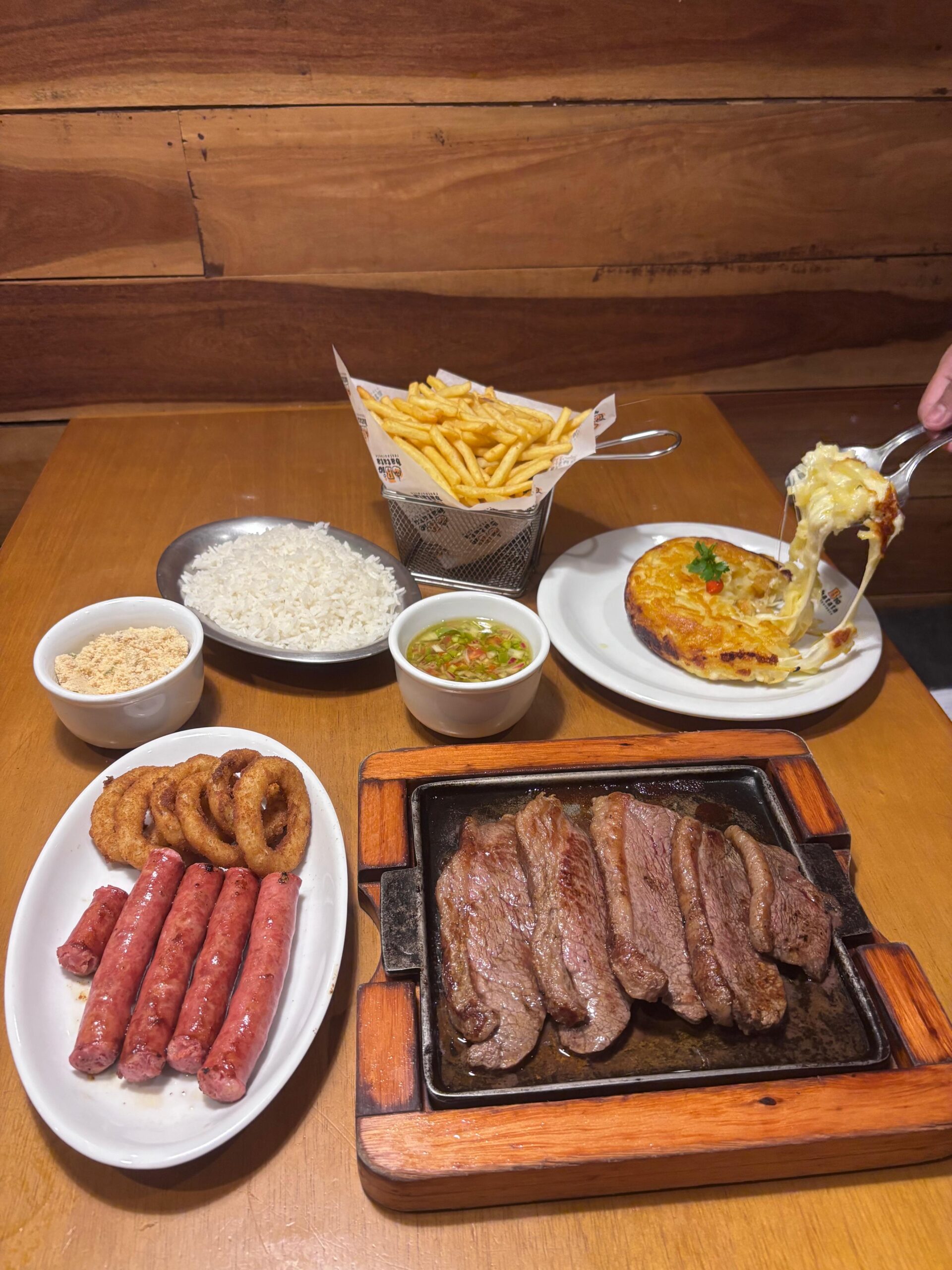 Fatiada e Grelhada, Acompanha Batata Rostie Pequena, Arroz, Fritas, Farofa e Molho à Campanha.